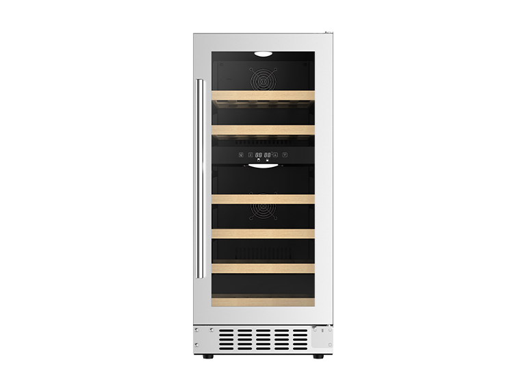 Temperature readings can be shown in either Celsius or Fahrenheit. Wooden rack shelving allows efficient storage of up to 33 bottles across two temperature zones. All components are rated for home or commercial use.Spacious and stylish, this high-quality wine cooler can keep up to 33 bottles of wine perfectly chilled in two separate zones. White glass door with stainless steel trim enhances any decor.  Maintain consistent optimal environments for both red and white wines using this cooler’s dual-zone temperature control, wooden rack shelving and reversible door. Interior fans provide efficient circulation for precise temperature uniformity on each rack.  Wooden rack shelving prevents excess vibration or bottle slippage at higher fan speeds. Automatic defrosting reduces hassle and prevents uneven icing in each zone. Front exhaust fan ventilation allows built-in installation. Keep up to 33 bottles of assorted wines properly chilled at their ideal temperatures for taste in two distinct zones using this stylish wine cooler. Enjoy both red and white wines whenever you wish with precision chilling on demand. Versatile, spacious and elegantly designed, this 33-bottle dual zone wine cooler allows you to properly chill and serve both red and white wines at their optimal temperatures. State-of-the-art compressor cooling system, adjustable thermostats and fan circulation provide energy efficient heat dispersion for optimizing your wines’ flavors. Double-pane glass door and wooden rack shelving create an attractive display.  Maintain the perfect separate environments for cherished red and white wine collections with this 33-bottle cooling cabinet. Experience each wine at its best, served at the customized temperature to suit its specific characteristics. Independent precision thermostats, frost-free operation and stylish white glass door ensure quality controlled chilling for a variety of premium wines with visual appeal. Age or keep frequently enjoyed wines perfectly cooled in distinct zones whenever desired.