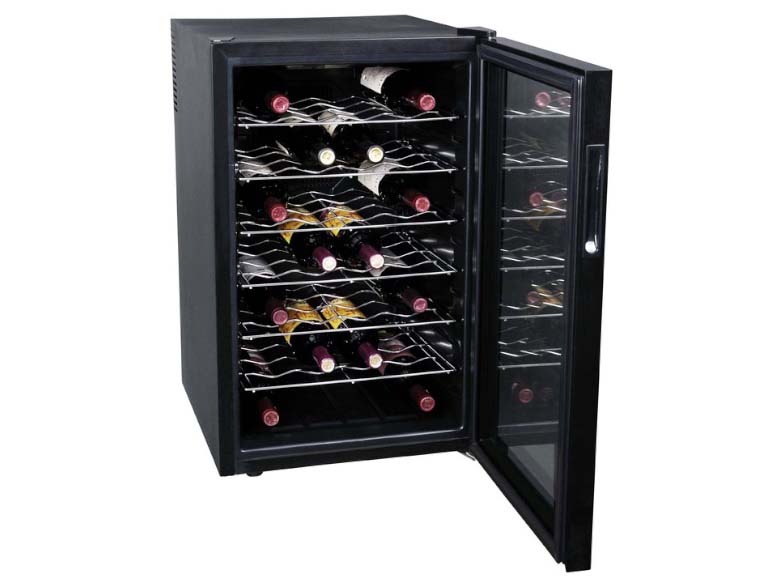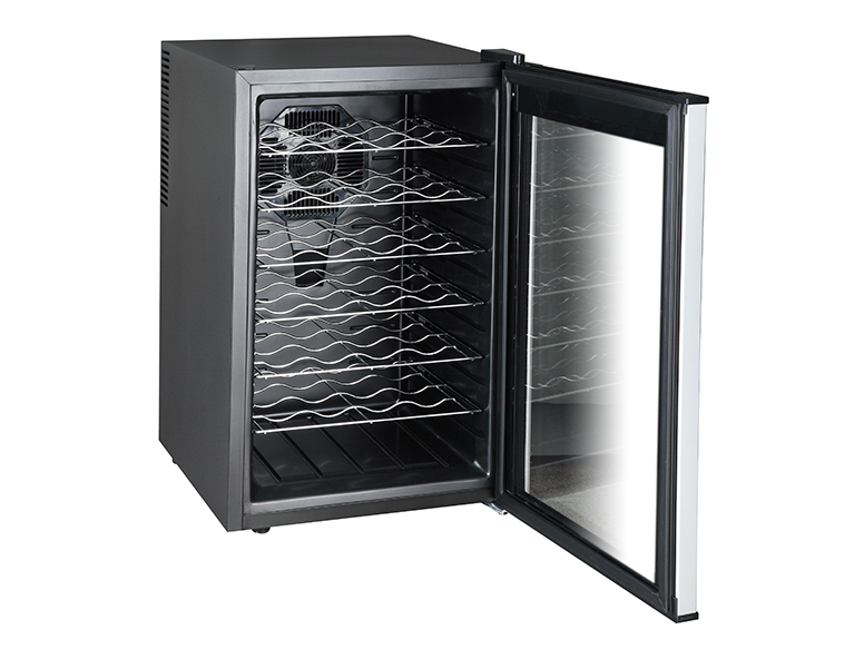 Six slide-out wooden shelves glide smoothly for access to every bottle in your collection. This self-contained unit requires no installation. Energy efficient and highly affordable, it delivers premium wine storage and service at a fraction of the cost of a traditional compressor cooler.Perfect for larger wine collections, entertaining or gifting to a fellow wine enthusiast, this 28-bottle cooler balances function, style and value. Its whisper-quiet thermoelectric technology keeps your wines in peak condition while blending seamlessly into your living space. Compact, convenient and attractively priced, it enables memorable experiences with friends by keeping wines perfectly chilled and close at hand for years of enjoyment. For affordable indulgence and dependable delights, this wine cellar is in a class of its own.Invest in the pleasures of life well lived - starting with this efficient and hardworking wine cooler. Ingeniously designed to make wines more accessible and gatherings with friends a source of cherished memories, it inspires connections that enrich each day. A veritable oasis of refreshment and good taste awaits behind its sleek glass door. Open up a world of possibilities and share them generously. This is living well made effortless.