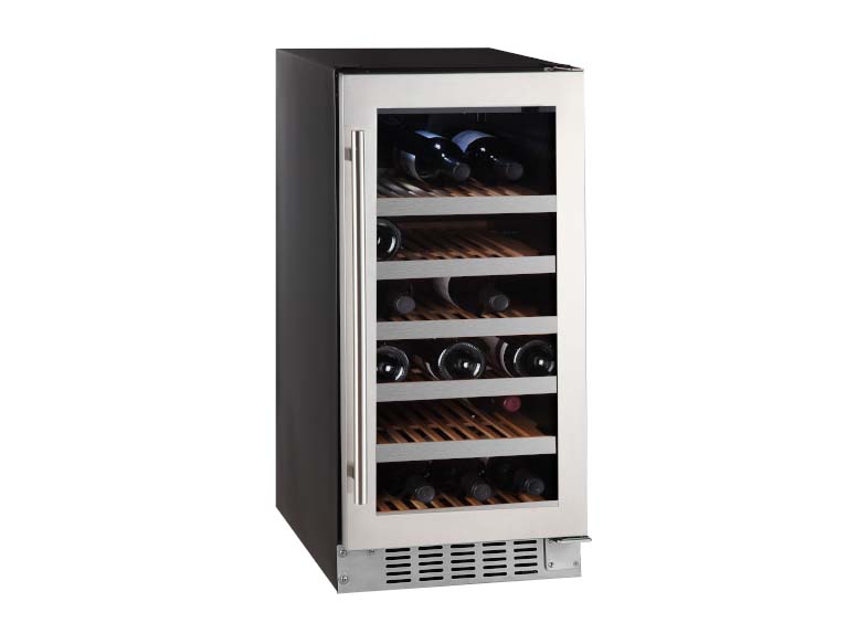 This 38-bottle single zone wine cooler features compressor cooling, white glass door with stainless steel trim and precise temperature control for built-in or freestanding use. It provides wooden rack shelving, Celsius/Fahrenheit display and frost-free operation.An adjustable thermostat lets you set the ideal temperature between 5-22°C/40-72°F. Settings and interior conditions are visible via a digital display.