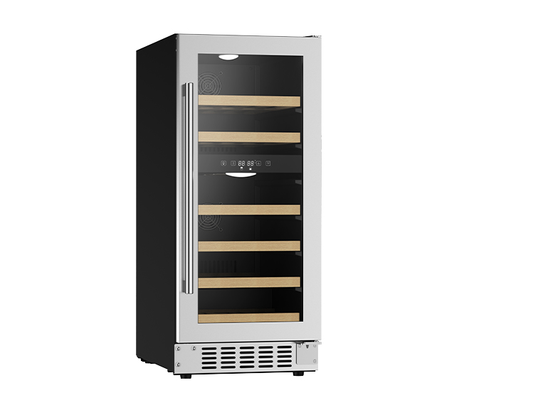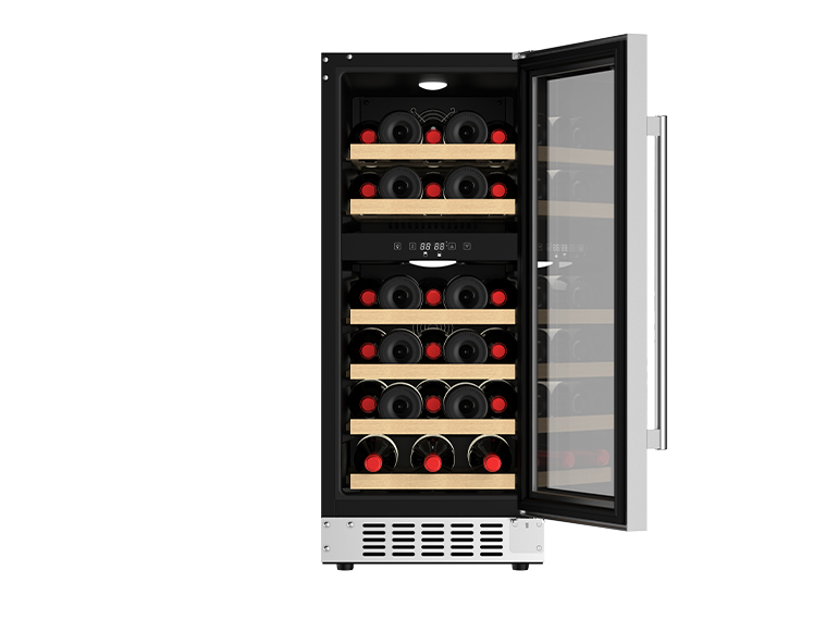Temperature readings can be shown in either Celsius or Fahrenheit. Wooden rack shelving allows efficient storage of up to 33 bottles across two temperature zones. All components are rated for home or commercial use.Spacious and stylish, this high-quality wine cooler can keep up to 33 bottles of wine perfectly chilled in two separate zones. White glass door with stainless steel trim enhances any decor.  Maintain consistent optimal environments for both red and white wines using this cooler’s dual-zone temperature control, wooden rack shelving and reversible door. Interior fans provide efficient circulation for precise temperature uniformity on each rack.  Wooden rack shelving prevents excess vibration or bottle slippage at higher fan speeds. Automatic defrosting reduces hassle and prevents uneven icing in each zone. Front exhaust fan ventilation allows built-in installation. Keep up to 33 bottles of assorted wines properly chilled at their ideal temperatures for taste in two distinct zones using this stylish wine cooler. Enjoy both red and white wines whenever you wish with precision chilling on demand. Versatile, spacious and elegantly designed, this 33-bottle dual zone wine cooler allows you to properly chill and serve both red and white wines at their optimal temperatures. State-of-the-art compressor cooling system, adjustable thermostats and fan circulation provide energy efficient heat dispersion for optimizing your wines’ flavors. Double-pane glass door and wooden rack shelving create an attractive display.  Maintain the perfect separate environments for cherished red and white wine collections with this 33-bottle cooling cabinet. Experience each wine at its best, served at the customized temperature to suit its specific characteristics. Independent precision thermostats, frost-free operation and stylish white glass door ensure quality controlled chilling for a variety of premium wines with visual appeal. Age or keep frequently enjoyed wines perfectly cooled in distinct zones whenever desired.