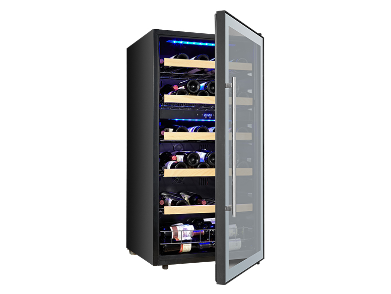 This freestanding dual zone wine cooler provides compressor cooling for up to 84 bottles of wine while maintaining a compact and space-efficient design. Two independent temperature zones are precisely controlled using digital displays, allowing you to separately chill reds, whites and champagnes at their optimum temperature. Auto defrost function reduces hassle by preventing ice buildup in each zone. The interior convection fan gently circulates air for consistent temperatures throughout the cabinet. An anti-vibration system and adjustable leveling feet provide a stable environment for wine storage and aging. Optional wooden or chromed racks allow for flexible organization and attractive display of your collection. Maintain the perfect climate for preserving and enjoying your wines with this high-quality, dual-zone wine cooler. Powerful compressor cooling maintains the set temperatures in each zone while efficiently. With a capacity of 84 bottles, this versatile wine cooler lets you store and serve diverse wines at their ideal temperature. Easily adjust and monitor the temperature of each zone separately using the digital displays. Ideal for wine connoisseurs and entertaining, this dual-zone wine cabinet provides the consistent temperature control for chilling reds, whites and champagnes. Convenient auto defrost reduces hassle, giving you more time to savor your wines. Keep all your treasured wines perfectly chilled and ready to pour at a moment's notice with this stylish yet compact, dual-zone wine cooler. Separately control and monitor each zone to maintain the optimum climate for preserving and aging your reds, whites and champagnes. Attractively organize and display your collection on wooden or chromed slide-out racks. Front ventilation and convection cooling provide an efficient, stable temperature environment for your wines around the clock. Maintain the perfect temperature for any vintage or varietal with this high-quality,freestanding dual zone wine cabinet. Precisely adjust and regulate each zone independently for the ideal climate to chill and protect your wines.