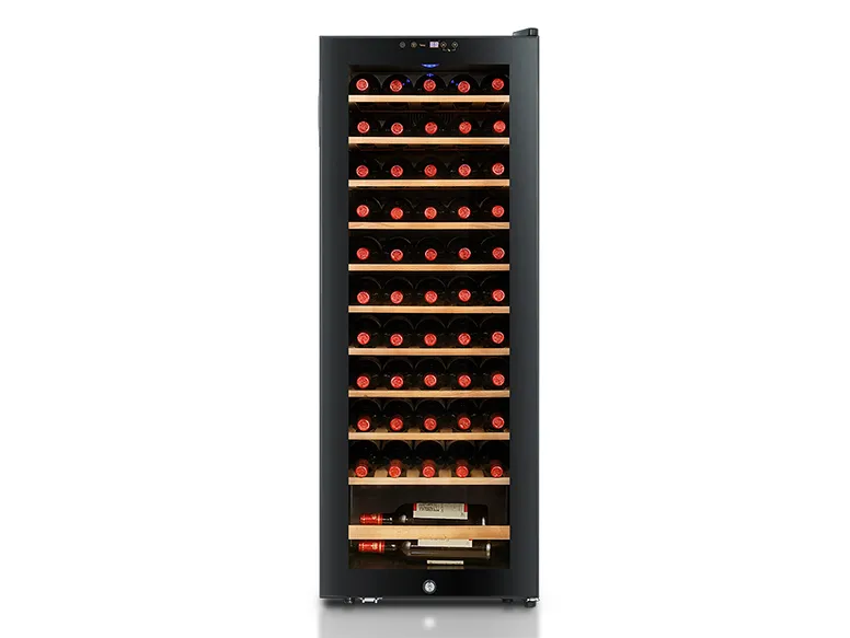 This freestanding wine cooler provides compressor cooling for up to 55 bottles of your favorite wines. The single temperature zone can be precisely controlled using the digital display to your desired temperature. Despite its ample storage capacity, this unit has a compact and space-efficient design that can fit anywhere in your home. The interior fan gently circulates air to ensure even temperatures throughout the cabinet so you can avoid damage to your collection from inconsistent hot or cold spots. To provide a stable environment for your treasured wine, this cooler features an anti-vibration system and adjustable feet for leveling on uneven surfaces. The sliding shelves are made of sleek chromed metal or natural wood, allowing for flexible organization and attractive display of your wines. Maintain the perfect environment for preserving and aging your wines with this high-quality, front-vented cooler. Convenient auto defrost functionality reduces the hassle of maintenance so you can enjoy your wine anytime.
