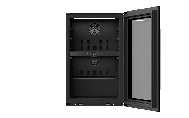 The cabinet's eye-level built-in design reduces strain. Maintain consistent optimal environments for both red and white wines using this cooler's dual-zone temperature control, interior lighting and wooden rack shelving. Separate fans for each zone provide zoned circulation for precise temperature uniformity on each rack. Wooden rack shelving prevents excess vibration or bottle slippage. Automatic defrosting reduces hassle and prevents uneven icing in each zone.  Keep up to 43 bottles of assorted wines properly chilled at their ideal temperatures for taste in two distinct zones using this stylish undercounter wine cooler.Enjoy both red and white wines with convenient access and precision chilling on demand. Streamlined, space-efficient and elegantly designed, this 43-bottle built-in dual zone wine cooler allows you to properly chill and serve both red and white wines at their optimal temperatures.