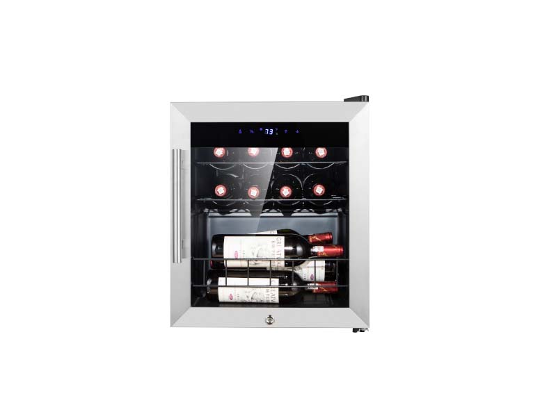 The glass door protects from UV light.  Four sturdy wooden/metal wire shelves hold 4 bottles each and slide out for convenient access. This self-contained unit requires no installation, simply plug in and place bottles on the shelves—chilling in minutes. An advanced cooling system and eco-friendly design provide an affordable wine preservation solution for homes and kitchens.This 15-bottle cooler is ideal for chilling and storing a variety of wines to have on hand for entertaining or enjoying every day. Its freestanding tabletop size allows placement anywhere, while sleek style complements most decors. Maintain your collection at peak freshness and explore different wines without breaking the bank. The perfect gift for budding wine enthusiasts or yourself, experience how life's simple pleasures can be enhanced when wines are kept in prime condition and ready to savor.