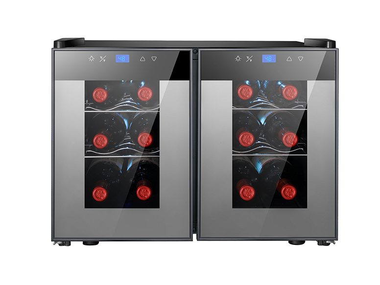 Wine cooler, thermoelectric cooling, 12 bottle capacity, Air cooling, compact size, table top, Ultra silent, Price cheap, dual zone, french door design, independent temp control, Gift of Choice