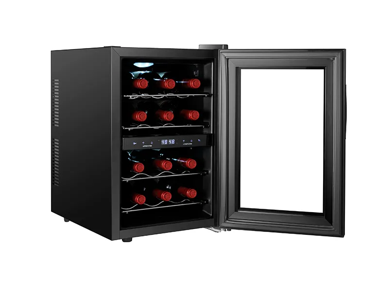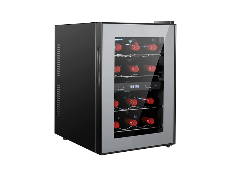 This compact 12-bottle dual-zone wine cooler features thermoelectric cooling technology for silent, vibration-free wine storage. Its space-saving design allows placement on tables, counters and other surfaces, while providing independent temperature control for keeping both reds and whites at their perfect serving temperature. The two separate cooling zones span a temperature range of 8-18°C/46-65°F . Each zone is insulated and equipped with its own temperature display, control panel, fan and vent to maintain uniform temperatures without mixing cooling air between compartments. The soft interior lighting and double-paned glass door elegantly showcase your collection while protecting from UV damage. Four slide-out wooden shelves hold 6 bottles per zone and glide smoothly for easy access. This freestanding unit requires no installation and has energy efficient, eco-friendly components with no compressor. Ultra-quiet and affordable, it delivers precision temperature control and premium wine preservation, allowing you to serve every wine at its peak.The perfect gift for wine lovers or addition to your own kitchen, this dual-zone cooler keeps your red and white wines chilled and ready for any occasion. Stylish yet durable, it complements any decor while keeping up to 12 bottles at their ideal temperature for enjoying solo or sharing with friends. Discover how life's simplest pleasures can be enhanced by the perfect glass of wine, made possible by this temperature-controlled cabinet. Inspiration and refreshment await behind its sleek glass door.Compact dual-zone thermoelectric wine cooler