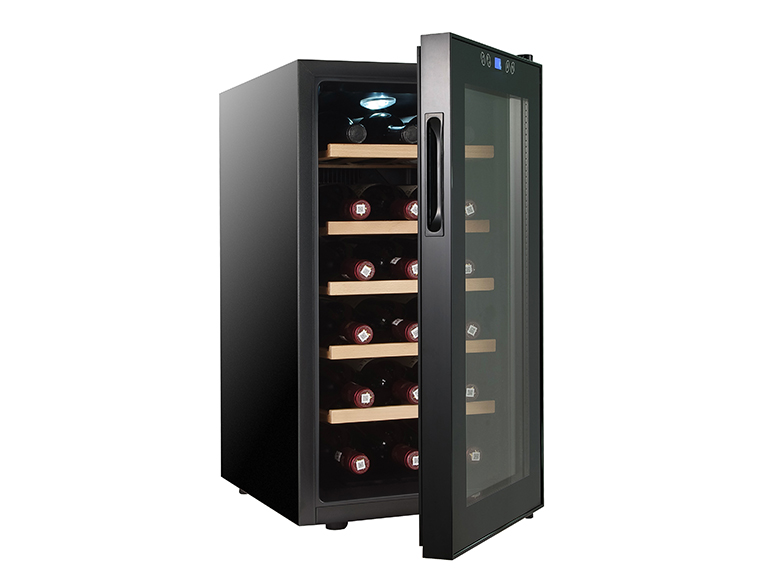 Shelves glide out smoothly for convenient access and are removable to accommodate larger bottles. This freestanding unit requires no installation and uses an environmentally-friendly refrigerant with no ozone depletion. Energy efficient and highly affordable, it provides impeccable wine storage and chilling at a fraction of the cost of a traditional compressor-powered cooler.Practical yet elegant, this 18-bottle wine cellar brings style, taste and convenience to your home. Its sleek countertop design suits any decor while preserving your collection at their perfect temperature. Quiet, compact and reasonably priced, it is the ideal gift for any wine lover or a worthwhile investment for yourself. Keep your wines chilled and share memorable moments with friends - all with a whisper-quiet cooler that delivers maximum enjoyment for years of use. Affordable luxury, exemplified.This versatile and hardworking wine chiller offers premium features, efficiency and value far exceeding expectations. Discover how simple pleasures can be inspired by the perfect glass of wine, made possible at the ideal temperature by this very cooler. A whole world of delight awaits inside.