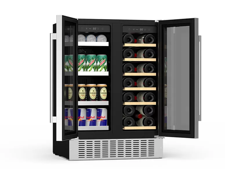 This 155-bottle dual zone wine cooler features compressor cooling,white glass door with stainless steel trim and adjustable temperature controls for built-in or freestanding use. It provides wooden rack shelving, Celsius/Fahrenheit display and frost-free operation.