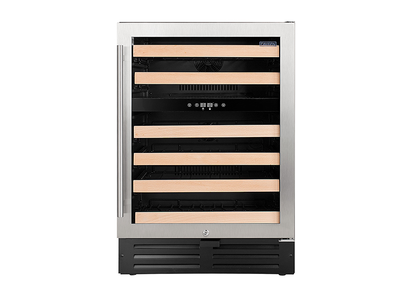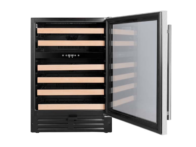 Temperature readings can be shown in either Celsius or Fahrenheit. Wooden rack shelving allows efficient storage of up to 46 bottles across two temperature zones. All components are rated for residential or commercial use.Spacious yet compact, this high-capacity wine cooler can keep up to 46 bottles of wine perfectly chilled in two separate zones. Stylish white glass door with stainless steel trim suits any decor.     Maintain consistent optimal environments for both red and white wines using this cooler’s dual-zone temperature control, wooden rack shelving and reversible door. Interior fans provide efficient circulation for precise temperature uniformity on each rack. Wooden rack shelving prevents excess vibration or bottle slippage at higher fan speeds. Automatic defrosting reduces hassle and prevents uneven icing in each zone.