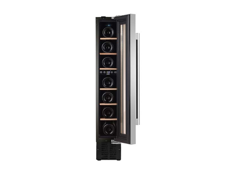 Front ventilation and a recessed handle allow for flush installation in cabinetry or counters. Open rack shelving allows efficient single bottle storage. All components are rated for a kitchen environment. Compact yet capable, this high-quality wine cooler keeps 7 bottles of wine perfectly chilled for any occasion. Its space-saving size and tempered glass door are stylish in any location. Maintain a consistent ideal environment for preserving and enjoying select fine wines using this small wine cooler’s precision temperature, shelving and convenient reversible door hinge.An interior fan provides efficient circulation for precise temperature uniformity on each rack. Wooden rack shelving prevents excess vibration or bottle slippage at higher fan speeds. Automatic defrosting reduces hassle and prevents uneven icing. Front exhaust fan ventilation allows flush installation. Keep up to 7 bottles of assorted wines or vintages properly chilled at the ideal temperature for taste and freshness preservation using this stylish yet compact wine cooler. Enjoy your wines whenever the mood strikes with consistent precision chilling on demand. Compact, efficient and stylishly designed, this 7-bottle wine cooler allows you to properly chill and serve select wines at their ideal temperature. State-of-the-art compressor cooling system, temperature control and fan circulation provide energy efficient heat dispersion for optimizing your wine’s flavor in a small footprint. Double-pane tempered glass door and rack shelving create an attractive wine display.Keep a small collection of your favorite wines perfectly chilled and ready to serve on-demand using this compact yet fully featured wine cooling cabinet. Consistent compressor temperature control, rack shelving, fan circulation and frost-free operation combine within a stylish and viewable housing, requiring minimal counter or floor space. Serve specially chosen wines at their ideal temperature for fullest enjoyment of aroma and taste.