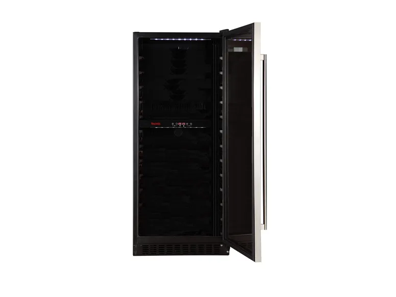 This 100-bottle single zone wine cooler features compressor cooling, white glass door with stainless steel trim and precise temperature control for built-in or freestanding use. It provides wooden rack shelving, Celsius/Fahrenheit display and frost-free operation.