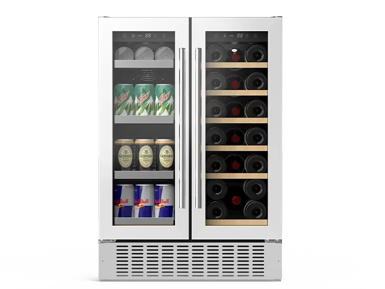 This 92-bottle dual zone wine cooler features compressor cooling,white glass door with stainless steel trim and adjustable temperature controls for built-in or freestanding use. It provides wooden rack shelving, Celsius/Fahrenheit display and frost-free operation.