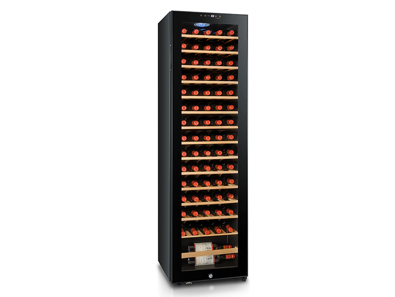 This compact yet large-capacity wine cooler provides compressor refrigeration for up to 75 bottles of wine. The freestanding unit has a space-efficient design that fits easily in any location in your home. Control the single temperature zone with precision using the digital display. Auto defrost functionality reduces maintenance requirements by automatically eliminating any ice buildup. The interior convection fan distributes refrigerated air evenly and silently throughout the cabinet, preventing harmful hot and cold spots that could damage your collection. To provide an ultra-stable environment for wine storage, this cooler incorporates an anti-vibration system and adjustable leveling feet. The slide-out racks are available in sleek chromed metal or natural wood, offering flexible organization options that beautifully showcase your wines. Maintain the optimum conditions for preserving and aging your prized wine selection with this high-quality wine cabinet. Front exhaust releases heat efficiently while the compressor cooling system maintains your set temperature. Conveniently store all your wine in a controlled climate with this spacious yet compact cooler. The digital display allows you to easily adapt the temperature to different types of wine. Keep your reds, whites and champagnes perfectly chilled and ready to serve.