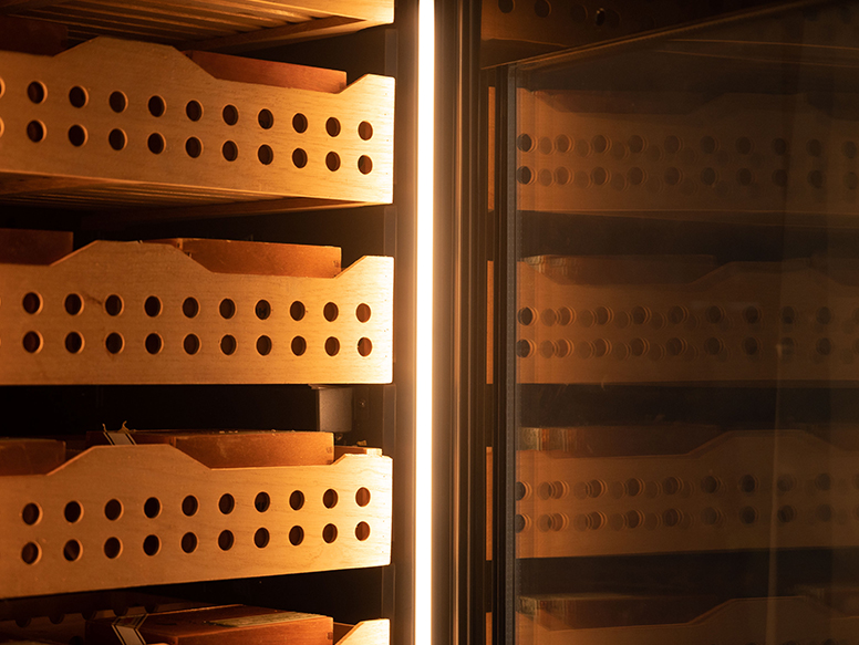 --Cedar shelves evenly distribute humidity and absorb excess moisture. Smoked glass doors protect cigars from UV damage. Soft interior lighting illuminates your collection for viewing.