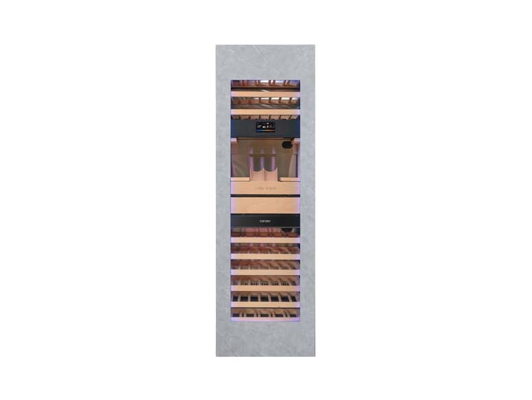 This 67-bottle three-zone wine cooler features variable frequency silent compressor cooling, independent temperature zones, and your choice of built-in or freestanding installation. It provides a stainless steel back plate, tempered glass door with rock finish, fingerprint lock, IoT smart screen, high-end logo projection
