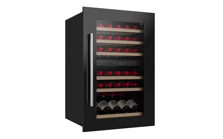 This 43-bottle dual zone wine cooler features built-in compressor cooling, an eye-level installation to minimize bending, and adjustable temperature controls for two separate zones. It provides wooden rack shelving, digital display, interior LED lighting and frost-free operation.