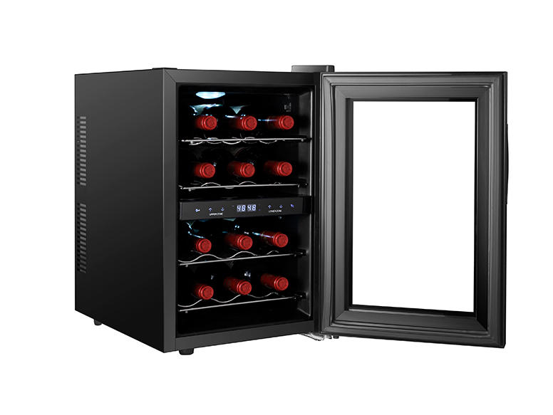 Wine cooler, thermoelectric cooling, 12 bottle capacity, Air cooling, compact size, table top, Ultra silent, Price cheap, dual zone, independent temp control, Gift of Choice