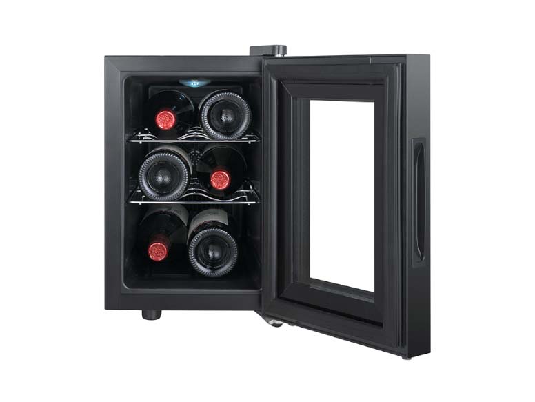 Wine cooler, thermoelectric cooling, 6 bottle capacity, Air cooling, compact size, table top, Ultra silent, Price cheap, single zone, Frost free, digital display, Gift of Choice