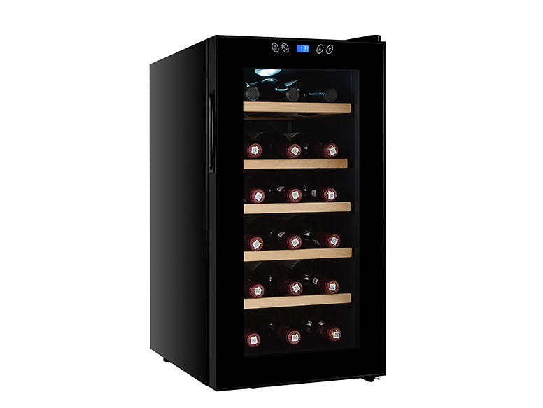 The space-efficient footprint allows placement on a tabletop, counter or floor, while the stylish black cabinet and stainless steel door frame complement any decor.A single-zone cooling system maintains an even temperature between 8-18°C/46-65°F for keeping both red and white wines chilled at their ideal serving temperature. Built-in fans circulate the air while vents efficiently dissipate heat, resulting in maximum cooling power with minimal noise. The double-paned glass door shields wine from UV light and an LED display clearly indicates the internal temperature which can be set with the touch of a button.